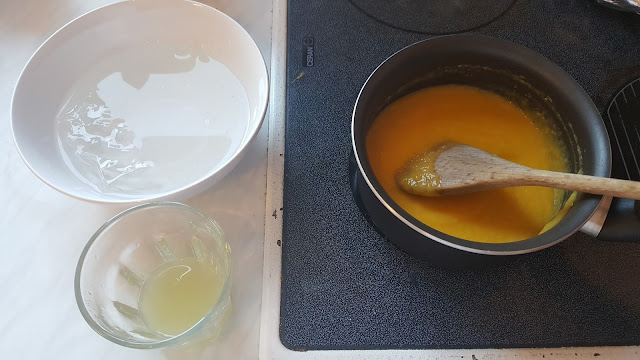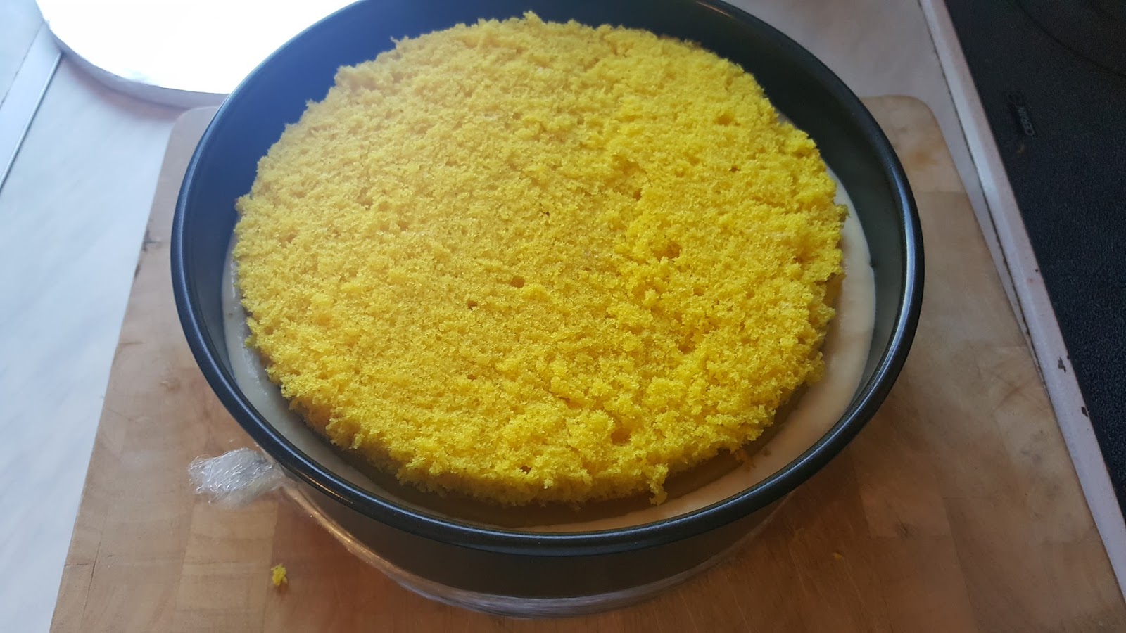 This can be done 1 day in advance. Line your 18cm baking pan with some greaseproof paper. In a bowl add your softened butter and sugar and mix for a few minutes. Next, add the eggs, whisk again, and then add the sifted flour and baking powder. Mix well and add yellow food colouring to get the colour you want (this step is optional!). Place your cake mixture into the prepared baking tin and cook for 20-25 min at 180 C / 350 F. Leave the cake to cool down completely and then cut in half and set aside.