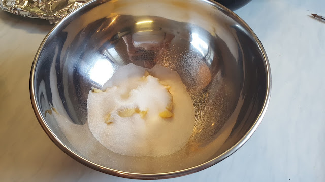 your mangos and add to a pan with sugar. Cook on a low heat until the sugar