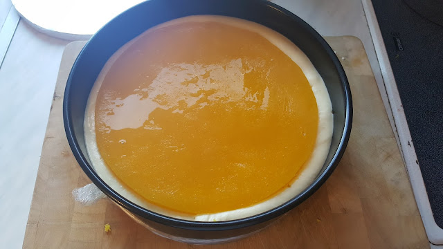 of the 18cm baking ring, making sure that it’s very tight. Pour the mango jelly puree