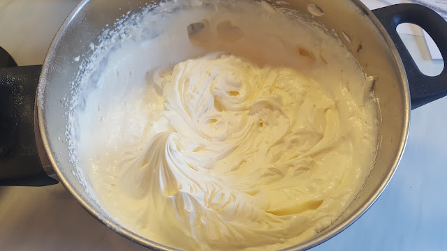heavy cream in a bowl, add 100g of icing sugar and whisk until soft peaks.