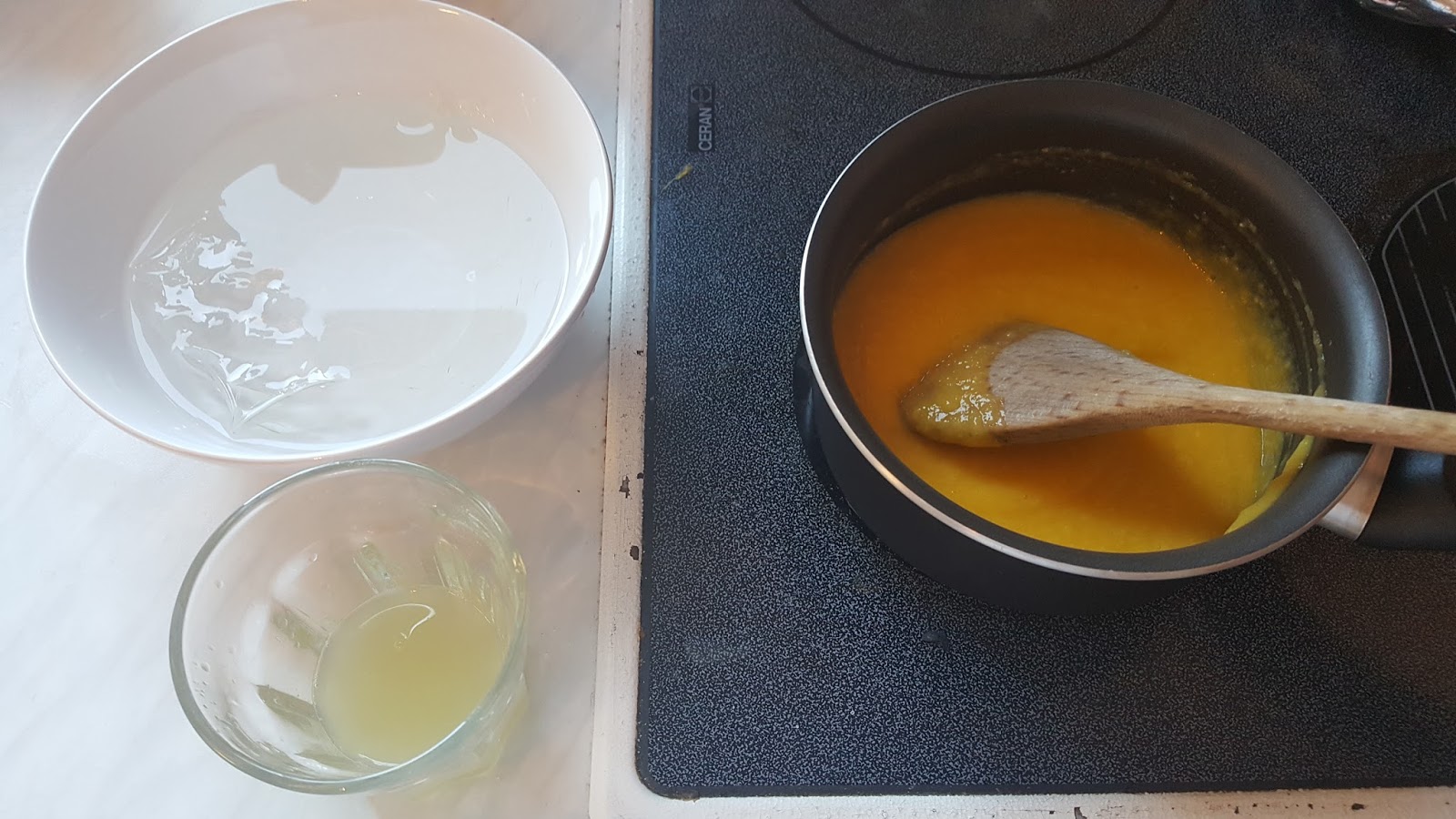 not let it boil. Squeeze out the gelatine leaves to get rid of excess water and